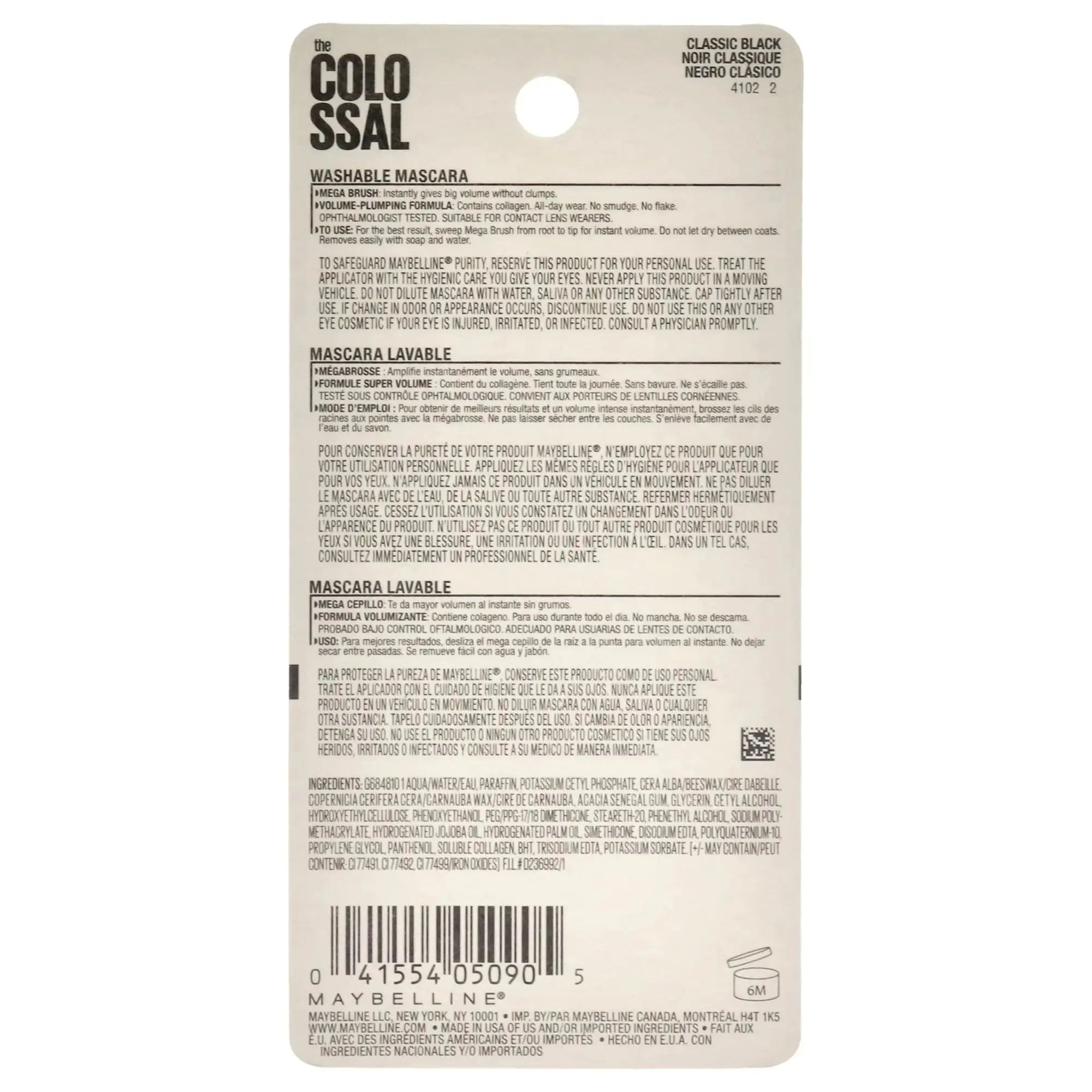 Máscara de pestañas lavable Maybelline Volum' Express Colossal, máscara de pestañas negra clásica
