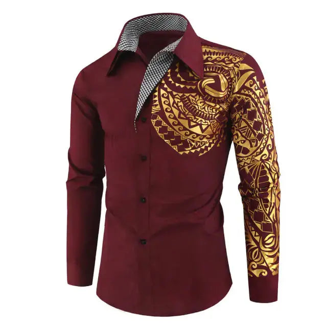 Crafted with meticulous attention to detail, this slim-fit, long-sleeve shirt exudes luxury with its high-quality material and intricate gold details on the black fabric. Whether you're heading out for a night on the town or attending a special occasion, this shirt is guaranteed to make a statement.