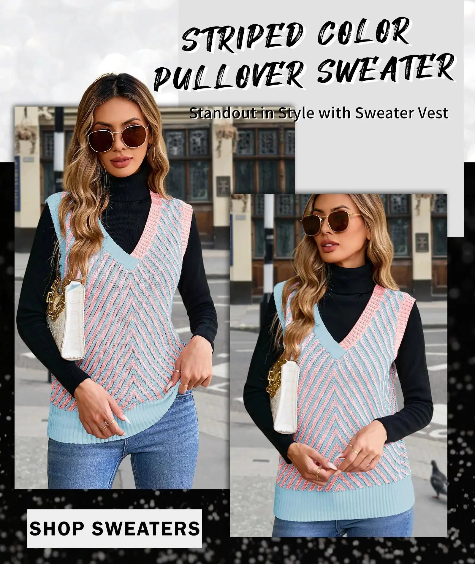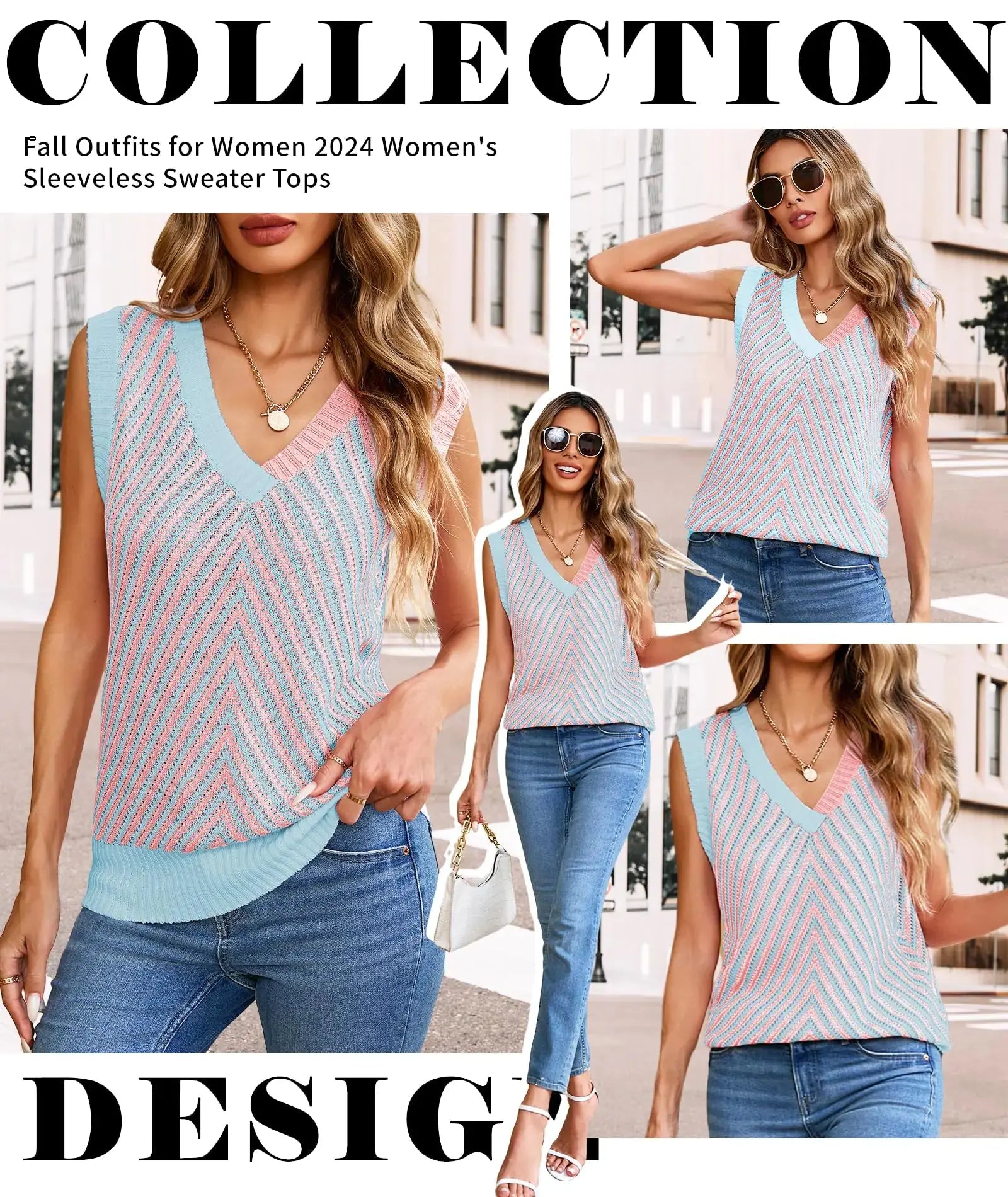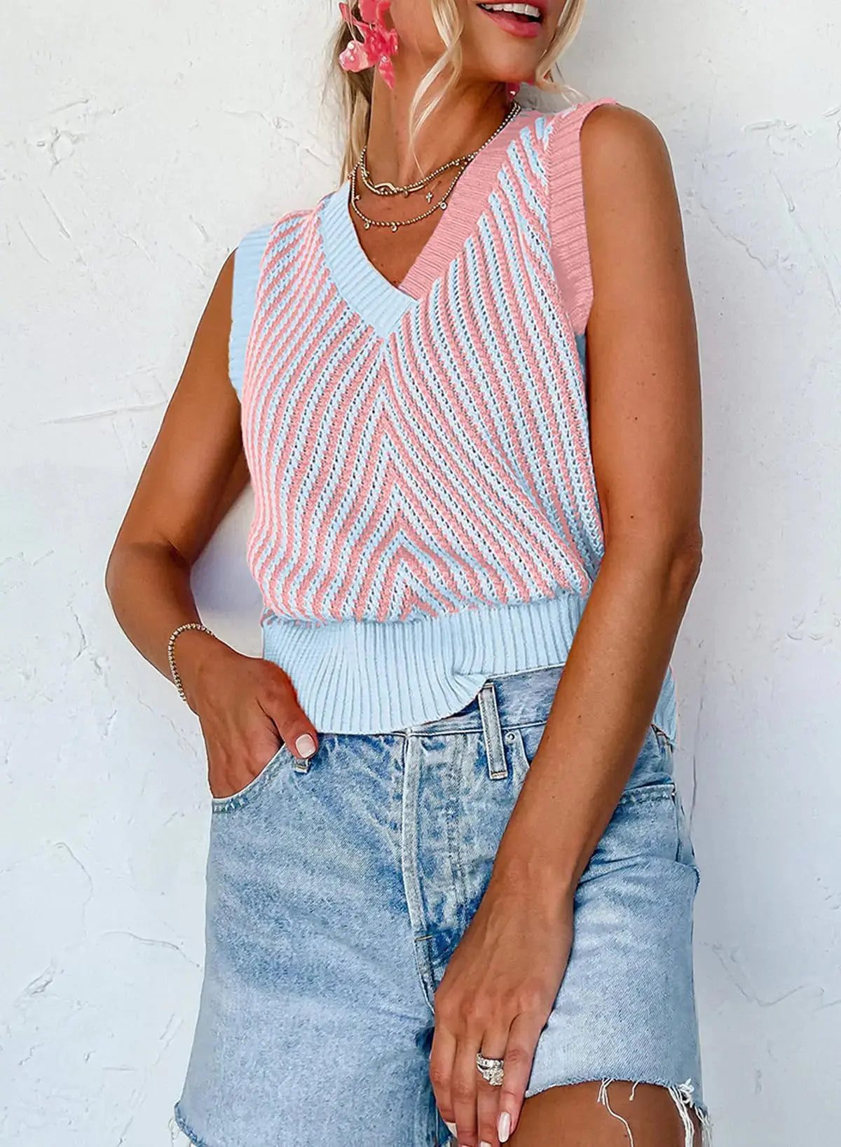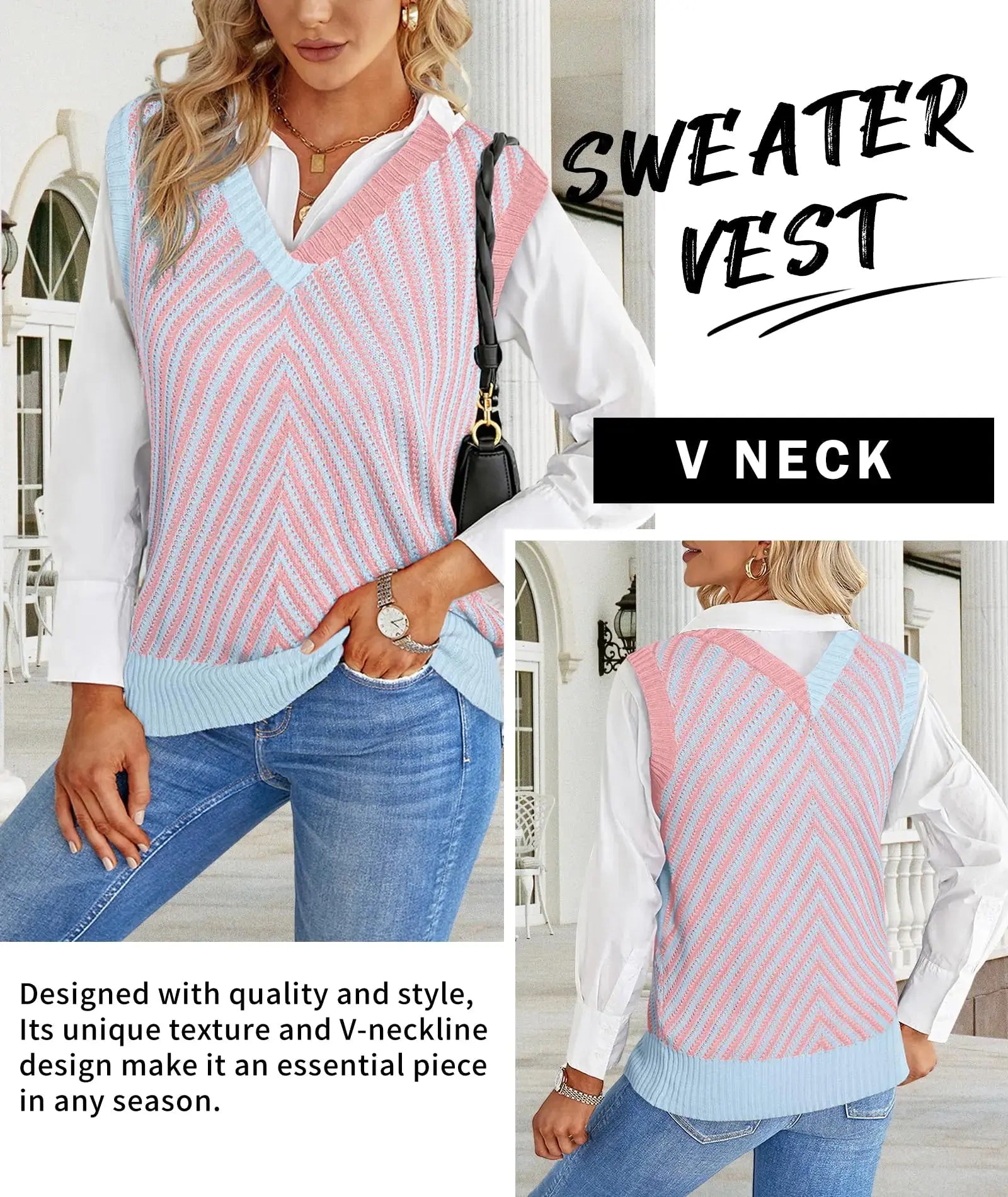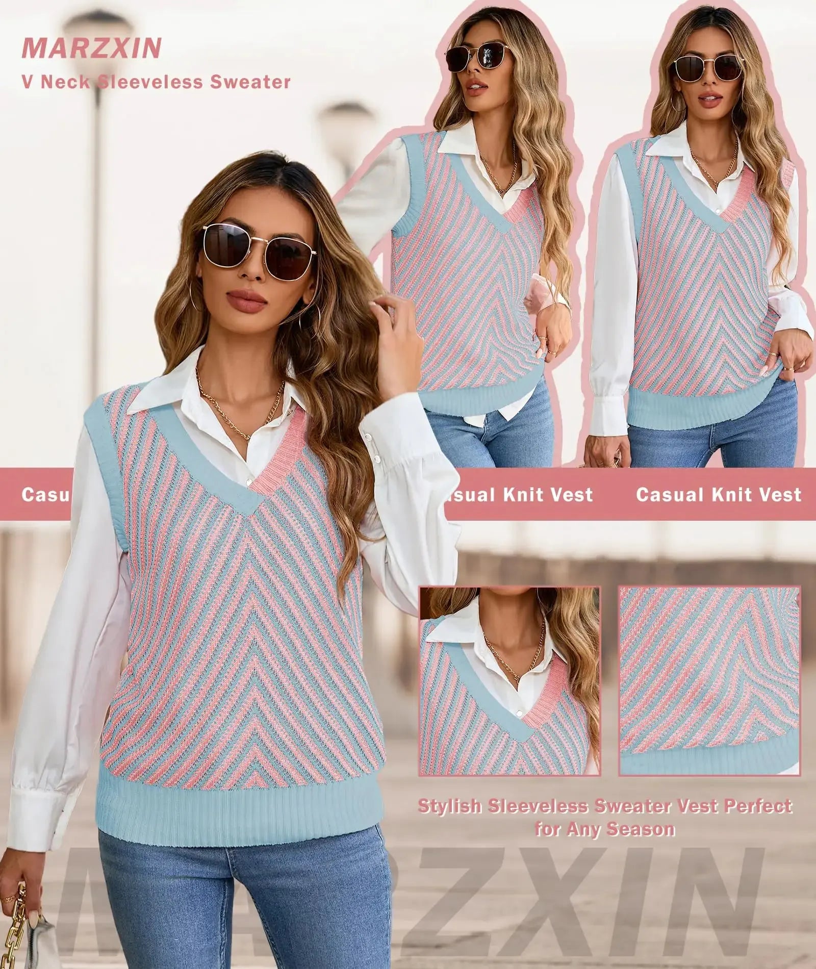 MARZXIN Womens Sleeveless Sweater V Neck Casual Strawberry Pink Contrast Chevron Knit V Neck Sweater Vest - Vivareflex Online